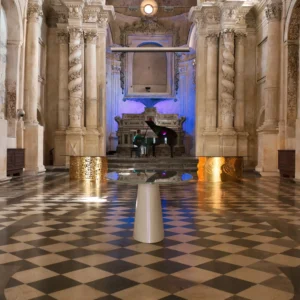 Like in a fashion show, the theatrical costumes from an Andrea Bocelli opera parade through the historic Ponte Rosso Art Gallery in the heart of Brera. Sophisticated and innovative design materials furnish the backstage, coloring the gallery walls with an unusual optical art show.